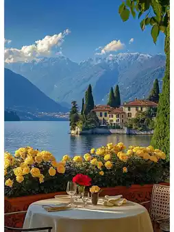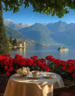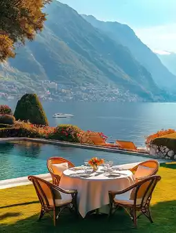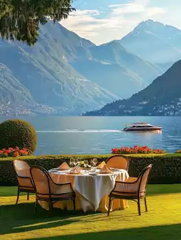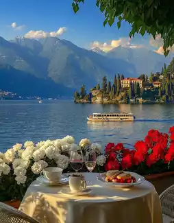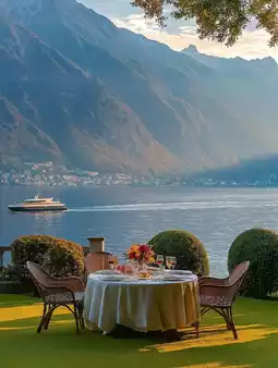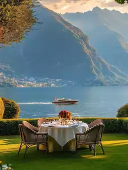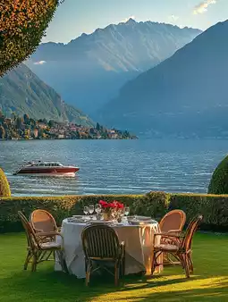 There is a table by Lake Como in Italy, the most beautiful table||There is a table by Lake Como in Italy, the most beautiful table, and of course, there must be a boat.