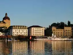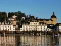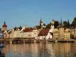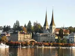Lucerne, Switzerland, a beautiful city nestled on the shores of Lake Lucerne, showcases a captivating splendor under the sunlight. The lake's waters shimmer, reflecting the soft-colored classical buildings along the bank. The iconic Chapel Bridge with its octagonal Water Tower is subtly visible, looking across at the twin-spired Hof Church, together narrating the long history of this ancient city. Cruise boats glide slowly across the lake, adding a sense of movement and romance to this peaceful scene. Strolling along the lake, one feels transported to a medieval fairy tale embraced by the Alps.