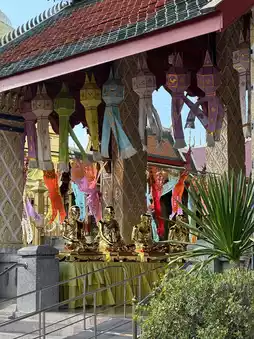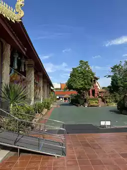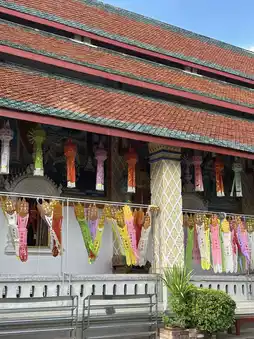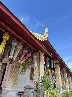 • Khong Gate and Pair of Lions: The eastern entrance has a Khong Gate with a pair of lions standing with their mouths open, decorated with royal costumes, following the ancient belief that lions were used to guard the temple.