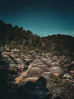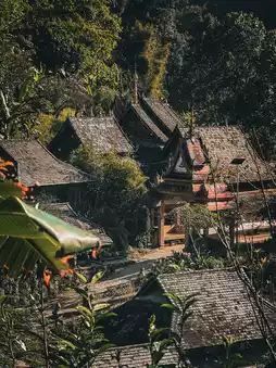-Viewpoint next to the Buddhist temple: Golden light bathes the entire ancient village at sunset.