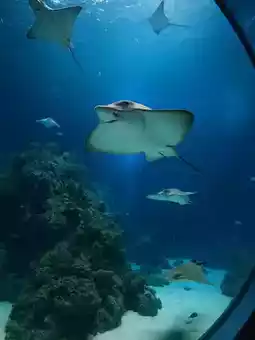 Walking through a 15-meter-long underwater tunnel, you'll witness the spectacular sight of giant rays and sharks gliding overhead.