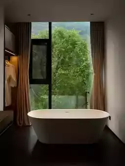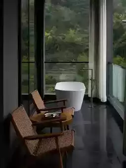 • Each room features a "floating design," with a full wall of floor-to-ceiling windows framing a 270° river view. Lying in the bathtub, you can watch the river cut through the mountains, and during the rainy season, mist drifts in through the window cracks!
