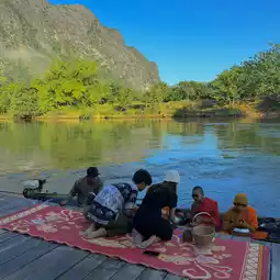 In the morning, monks will come by boat to give us sticky rice alms. It is a picture of the way of life of the people here. It is considered another accommodation that is very suitable for relaxing in this rainy season. Let's go. 🏠⛰️☔️