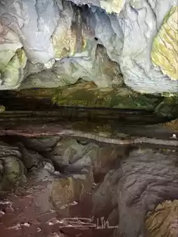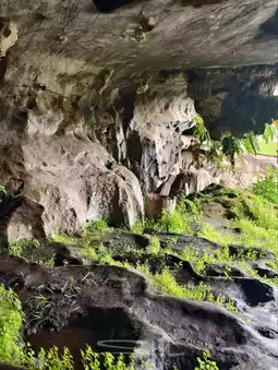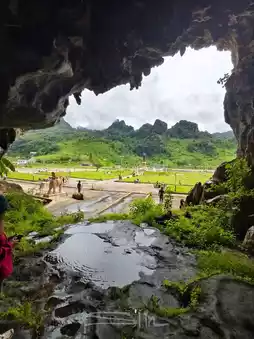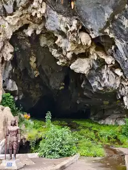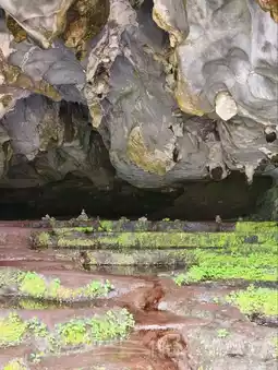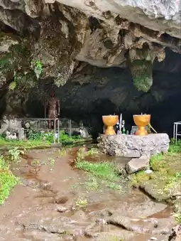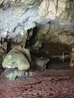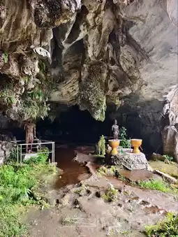 The first is the large cave, with its entrance clearly visible. It's located to the left of the sign (facing the sign). This cave is not very deep, approximately 200 meters. The entrance is still intact, with a small limestone waterfall. Due to the high number of visitors, the limestone waterfall has been lost. The path is slippery, so be careful. The second cave entrance is on the right side of the sign. Look for the guard statue. The last statue has a small opening to enter.