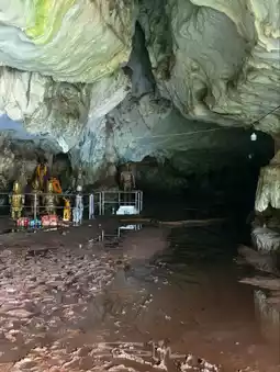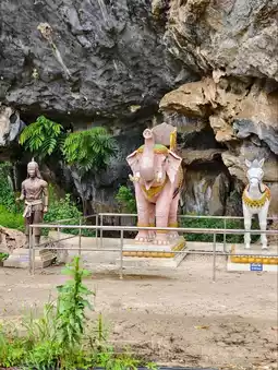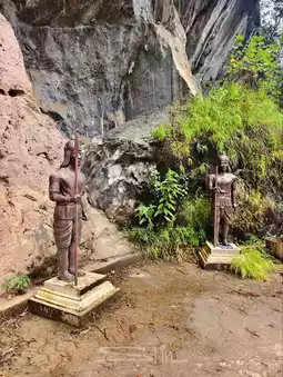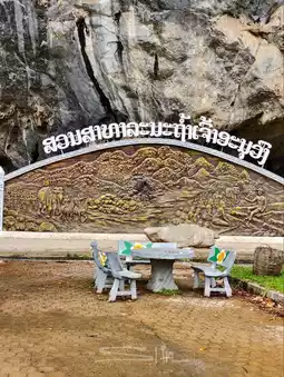 The front of the cave is landscaped with a public garden and features a standing statue of Chao Anuwong.