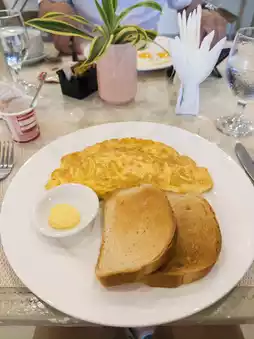 The hotel features several swimming pools, perfect for sunbathing or relaxing in the water during the day. If you don’t feel like venturing far, you can easily spend a leisurely day within the hotel. Breakfast includes a simple mix of Filipino and Western options, such as grilled meat with rice, omelets, toast, and fruit. While the selection isn’t extensive, the taste is quite good.