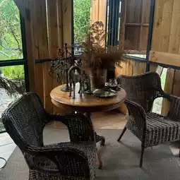 2. Surrounded by a lush, shady garden with a cool mist spray.