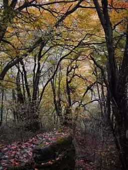 🌲 Trees grow wildly, 🍂 fallen leaves cover the trail