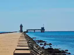 Upon entering the resort, the winding coastline and uniquely charming natural scenery first catch the eye (see Image 1). A robust, lush tree stands in harmony with the reefs and stone mortars, backed by the vast blue-green ocean. The sky is clear and bright, palm leaves gently sway, sketching a rich tropical coastal atmosphere. Walking along the wide stone boardwalk deeper inside, a gray-white lighthouse stands majestically amid the blue waves (see Images 2 and 3), serving both as a maritime landmark and a romantic spot for visitors to pause and take photos. In the distance, the shimmering sea and scattered fishing boats fully reveal the vastness and tranquility of the ocean.