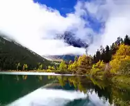 A glacial lake near the valley entrance with crystal-clear blue waters, surrounded by ancient forests. In autumn, the colorful foliage reflects on the lake, creating breathtaking scenery.