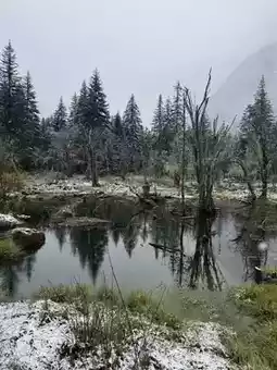 The warm sunlight reflects off the crystal-clear lake like a mirror. Nearby, the golden-red forest of birch and maple trees blankets the mountains in grandeur. The high grasslands make you feel delightfully small in comparison.