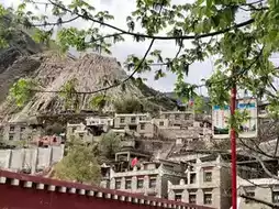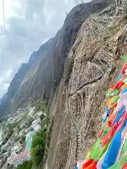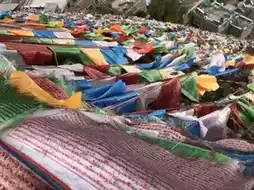 The main scenic spot in the Tibetan village is the prayer flags on the mountaintop. From the viewing platform, you can see the entire Tibetan village. The wind is strong, and the prayer flags flutter beautifully.