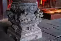 The stone carvings of auspicious animals and inscriptions under the pillars of the main hall