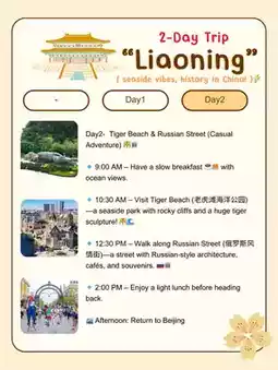🔹 2:00 PM – Arrive in Dalian, check into a seaside hotel 🏨, and breathe in the fresh ocean air! 🌊