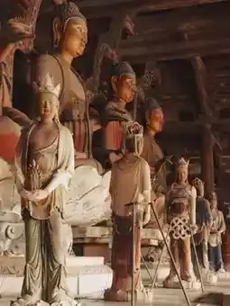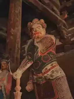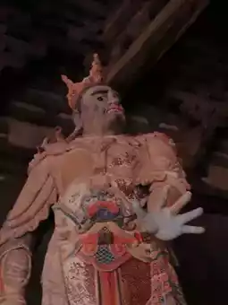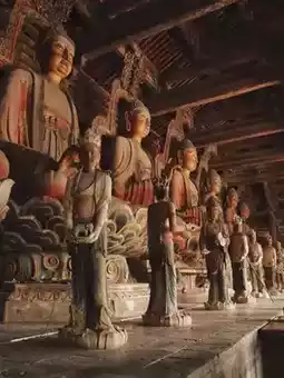 🌟【Flying Apsaras Color Paintings】Look up at the beams, rafters and brackets in the hall, and you will see patterns of male flying celestial beings, lotus flowers, Baoxiang flowers, peony flowers, etc. The colors are bright and gorgeous, and the images are vivid and natural. This is the only extremely rare example of colored paintings in ancient wooden structures in the world.