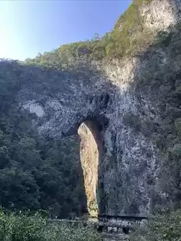 Strolling through Libo's Big and Small Seven Arches Scenic Area feels like walking through a painting, with its fresh air and breathtaking scenery. The most fortunate moment was witnessing sunlight pouring through the natural bridge arch in the Big Seven Arches area, creating a golden, shimmering image resembling a Guanyin statue (Figure 14). According to the staff, this magical Guanyin image appears only for about ten minutes when sunlight hits the bridge arch at just the right angle—neither earlier nor later. Unaware of this phenomenon beforehand, we felt incredibly lucky to have encountered it by sheer coincidence.