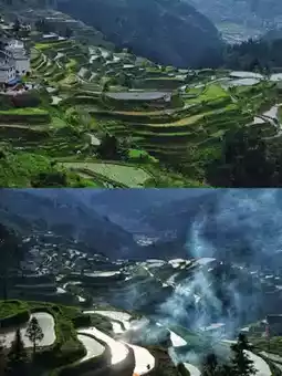 💥 God-tier shot: Wooden viewpoint telephoto shot🔭 (S-curve terraces + smoking village chimneys🏡)