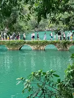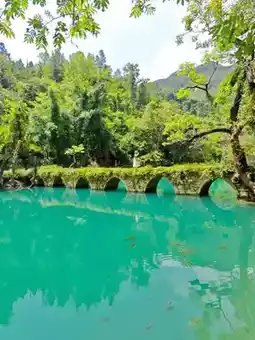 A turquoise-blue natural pool fed by a gentle waterfall, known for its calm, glass-like surface.