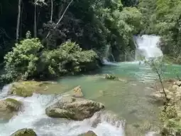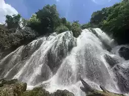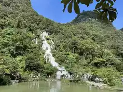 The Emerald Valley Waterfall features water flowing down layered rock walls, surrounded by lush greenery, resembling jade beads cascading down. This tranquil spot is perfect for sitting quietly and enjoying the natural symphony of waterfalls and birdsong.