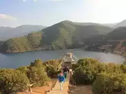 Walking further, we explored the peninsula itself, now lined with shuttered inns and cafés—closed to protect the lake from pollution. The commitment to preserving Lugu’s purity moved us; perhaps this is why its waters remain so startlingly clear. On the way back, a narrow uphill path led us to the Li Ge Viewing Platform.Though the climb required care (no handrails, just steep steps), the reward was the iconic postcard vista:the peninsula curled like an emerald ribbon against the lake. No mirror-like reflections under the midday sun, but the scene was still a masterpiece of nature,proof that Lugu’s charm needs no filter.