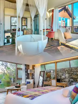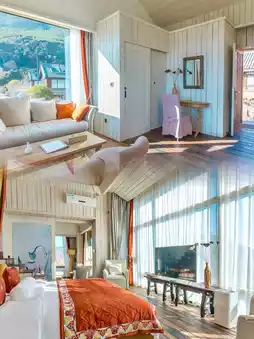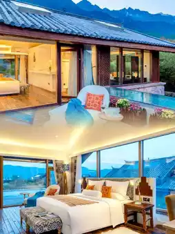 The split-level design of the rooms here gives a stronger sense of space. The soft furnishings are designed with blue as the main tone, the bedding is extremely comfortable, and there are large floor-to-ceiling windows on all four sides of the room, so you can enjoy the view of Jade Dragon Snow Mountain from the room.