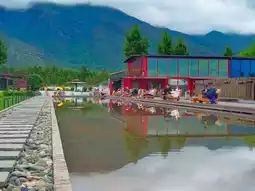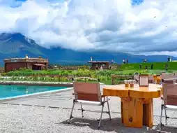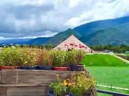 Another charming coffee shop with a stunning backdrop of Jade Dragon Snow Mountain, located near Baisha Village in Lijiang. The cafe is designed with simplicity that harmonizes with the natural scenery. It offers plenty of photo spots, including the popular rooftop view, giant wooden chairs, expansive grass fields, elevated grassy slopes, and the picturesque pondside. Additionally, there is an accommodation zone for tourists to relax and recharge while enjoying the million-dollar view.