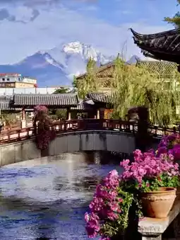 หากในช่วงที่มีสภาพอากาศดี สามารถมองเห็นภูเขาหิมะมังกรหยกเป็นฉากหลังอันสวยงาม