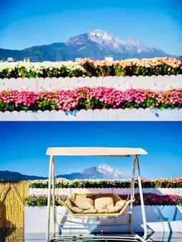 Here’s the highlight! From the eighth floor, you can directly see the sun setting over Jade Dragon Snow Mountain – a breathtaking 360° panorama! 🤯 We were incredibly lucky; it didn’t rain during our visit. We went up to the eighth floor in the morning to wait and watch as the golden sunlight gradually filled the summit of Jade Dragon Snow Mountain. The entire snow-capped mountain came into clear view, with clouds drifting between the peaks. ☁ It felt like the whole world was bathed in a golden glow. ✨ We quickly grabbed our phone to take pictures. 📸 My social media was full of people asking for the address! Whether you're sitting in the room sipping tea or just relaxing during the day, looking up at the snow-capped mountains and blue sky is so relaxing!