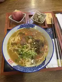 On the second day, we left early to visit Jade Dragon Snow Mountain and Blue Moon Valley. We watched the Impression Lijiang show in the rain, took a scenic train ride, and then returned to the old town. Dinner was at a noodle shop near the hotel. The noodles were soft and the soup was rich.