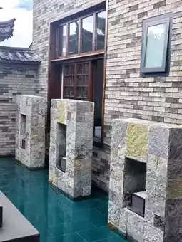 The water feature in the courtyard is the finishing touch—the stone landscape pillars reflect in the clear water, forming a symmetrical frame with the eaves of the ancient town in the distance. When the wind blows, the ripples gently sway, and even time seems to slow down.