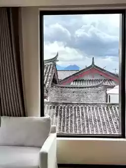Open the door to the room, and the minimalist yet warm design immediately captures your attention. The white bedding is fluffy and soft, like being embraced by clouds; the combination of natural wood and warm brown tones creates a cozy texture in the soft light. The most touching is the window—open it, and the blue-tiled eaves of Shuhe Ancient Town become the view. In the distance, the mountains are like ink paintings, clouds drift leisurely over the peaks, in the morning you can watch the sunlight gild the tiles, and at dusk admire the sunset turning the sky orange-red. This kind of “lying down and enjoying the view” comfort—who wouldn’t love it?