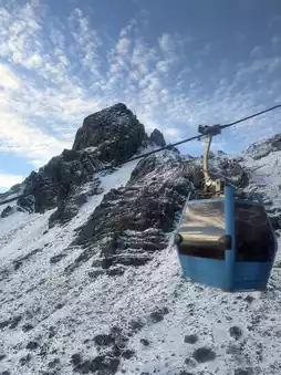 - Ride the cable car through snowy peaks — this view is 🤯! Blue skies, rugged cliffs, and icy vibes.