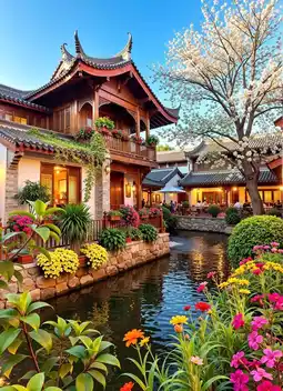 Sitting at a riverside teahouse, nibbling on freshly baked flower cakes🌹, looking up to see the white clouds sent by Jade Dragon Snow Mountain, and looking down to see the stunning reflections of flowers and bridges overlapping⛅️