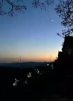 In the evening, when the sun sets, the sky is dyed orange, and flocks of birds fly by. After a while, I could see the street lights in the village and the clear and bright 🈷️ teeth in the sky. I happened to see Venus and the moon that day.