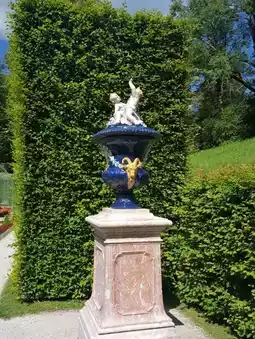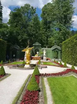 The castle is completely surrounded by forest, and the garden in front and the Alps behind it create a magnificent landscape. The interior is filled with gorgeous decorations, and in the garden you can see a beautiful fountain with a golden goddess statue.