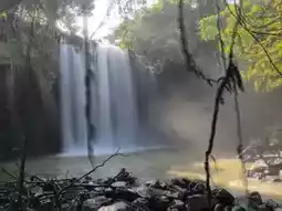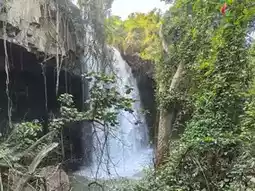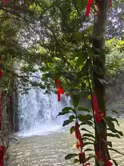 The waterfall is formed by a drop in the riverbed, with a height of 20 meters and a width of about 20 meters, creating a magnificent sight. At the top of the west side of the waterfall stand two ancient banyan trees, with several large stones at their base, one of which is inscribed with the words "Mountain Valley Waterfall". The waterfall is surrounded by strange rocks of various shapes, and the trees behind it are lush and green. The waterfall cascades down like a dragon spitting pearls, creating a spectacular sight. In front of the waterfall are two real peacocks for visitors to take photos with, free of charge. Under the strange rocks is a large black cave, known as "Guanyin Cave", where the waterfall cascades down the cliff like smoke and mist, blocking the entrance to the cave, reminiscent of the Water Curtain Cave in Journey to the West. Near the waterfall is a temple dedicated to Lady Xian, where visitors can learn about the local history and culture.