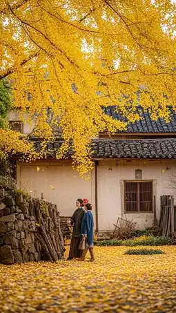 Thousand-year-old ginkgo trees, golden fallen leaves covering the ground, perfect for photos