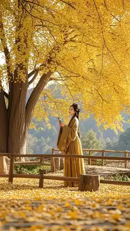 Morning mist envelops, sunlight filters through ginkgo leaves, creating a full atmosphere