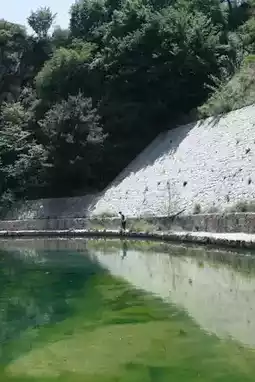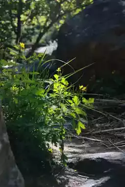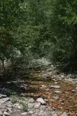 The path follows a lively stream that winds through rocky crevices, with small waterfalls cascading down steeper sections. Midway up, there’s a tiny reservoir teeming with tadpoles, river snails, and birds stopping to drink or bathe.