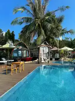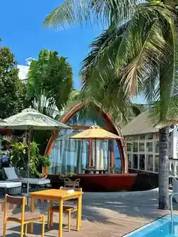 Cleanliness: Upon entering, there's a reassuring wooden ambiance, clean and tidy. Environment: You can see the sea from the room!! There are big coconut trees and a super large swimming pool which is great!