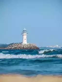 The red-and-white tower contrasts beautifully with the blue sea. The seaside mini-train and photogenic spots make it look like a scene from a Miyazaki film.