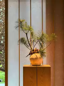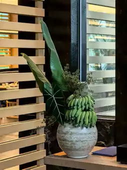 - In the lobby, pine branches in earthenware pots exude rustic Zen, as if capturing a slice of mountain serenity. Elsewhere, quirky yet harmonious arrangements—like green bananas paired with broad-leaf plants in clay vessels—smash floral clichés by blending local flavor with artistry🍌
