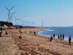 Yulinzou in Dongfang, with windmills on the left and a lighthouse on the right, sunlight scattered on the sea surface, turning into thousands of stars.