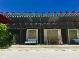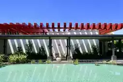 🏊♂️ Semi-outdoor 25-meter heated pool, eye-catching in color, with a red roof resembling shutters, protecting swimmers from UV rays at noon.