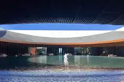 🌕 Water Curtain Lobby: "Beginning with the moon, ending with the sea," the circular pool at the bottom of the lobby symbolizes the blue sea, while the circular skylight above represents the full moon, encircling heaven and earth.
