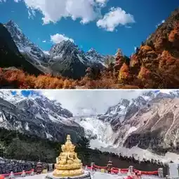 The weather has high visibility, allowing close-up views of the Gongga Mountain glacier. Morning sunlight shines on the snowy peaks of Gongga Mountain, sparkling golden. Icefalls, ice caves, ice bridges, and other sights are breathtaking.