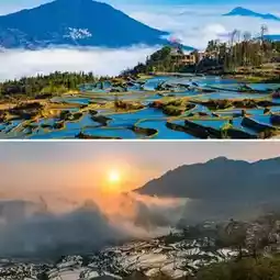 From early November to March of the following year, standing among the winding ridges of the Yuanyang Terraces, looking down, clear mirror-like water surfaces quietly spread out, reflecting the blue sky.