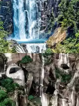 The "Grandest Waterfall in China" lives up to its name! Standing on the viewing platform, the mist sprays your face, and rainbows appear and disappear. Wearing a *hanfu* here makes for stunning photos (non-slip shoes recommended). After descending the mountain, I stopped by the former residence of Ji Gong and listened to the fascinating stories of the Living Buddha.