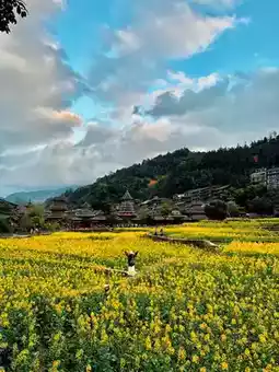 At this time, a large field of rapeseed flowers is in full bloom in front of the gate of the Dong village! The mist is lingering in the mountains. You can watch the changing wind and rain outside the window, drink a cup of tea, and overlook the ancient but still inhabited drum tower and wooden houses of the Dong village. Walking on the bluestone pavement, the mossy green vegetation is dyed even greener after the rain. Local residents gather in the drum tower to roast charcoal and chat about family matters.