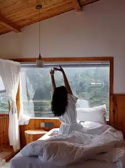 In the early morning, the sun shines gently in front of the window, and when I open my eyes, I see the layered terraces